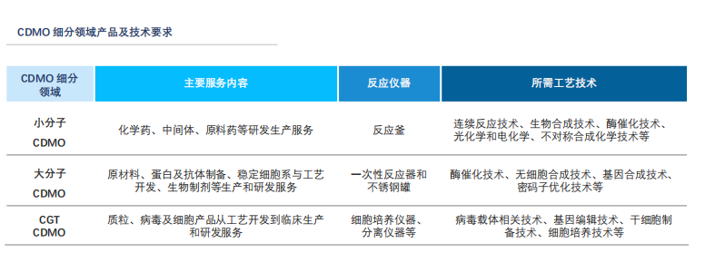 CDMO 服務(wù)范圍—— CDMO為醫(yī)藥企業(yè)提供多維度的藥物研發(fā)及生產(chǎn)工作,服務(wù)領(lǐng)域持續(xù)向產(chǎn)業(yè)上下游延伸 CDMO提供具有技術(shù)附加值的研發(fā)服務(wù)和產(chǎn)能支持,貫穿研發(fā)的各個(gè)階段。CDMO 企業(yè)為制藥企業(yè)搭建的服務(wù)范圍包括臨床前期和臨床階段的CMC 服務(wù)、原料藥、中間體、制劑的工藝開發(fā)生產(chǎn)和包裝服務(wù)等。在藥物研發(fā)階段,CDMO 可提升藥物研發(fā)效率、降低研發(fā)成本;在藥物商業(yè)化階段,CDMO 可通過不斷的工藝優(yōu)化降低企業(yè)生產(chǎn)成本、提高生產(chǎn)效率,同時(shí)保障產(chǎn)品質(zhì)量和供應(yīng)的穩(wěn)定性。 CDMO 細(xì)分領(lǐng)域 —— 由于各類型藥物研發(fā)生產(chǎn)的差異,CDMO 行業(yè)逐漸細(xì)分為小分子、大分子與 CGT CDMO 根據(jù)藥品類型,目前 CDMO 細(xì)分領(lǐng)域可主要分為小分子 CDMO、大分子 CDMO(包括多肽/抗體/蛋白/疫苗等)及細(xì)胞基因療法(CGT)CDMO 三大類。小分子藥物結(jié)構(gòu)簡單、化學(xué)合成步驟的可拆解性強(qiáng),且多數(shù)化合物具有高穩(wěn)定性、轉(zhuǎn)運(yùn)方便的特點(diǎn),因而小分子 CDMO 產(chǎn)品具備標(biāo)準(zhǔn)化流程,遵循 “基礎(chǔ)化學(xué)品 — Non-GMP中間體 — GMP中間體 — 原料藥 — 制劑” 的產(chǎn)品制備路徑,生產(chǎn)路徑易于產(chǎn)業(yè)化;而相比于小分子化學(xué)藥物,大分子生物藥結(jié)構(gòu)更為復(fù)雜、其開發(fā)成本及生產(chǎn)/仿制難度更高,大分子 CDMO 龍頭企業(yè)以技術(shù)與產(chǎn)能等優(yōu)勢(shì)占取較高市場(chǎng)份額;細(xì)胞與基因療法生產(chǎn)工藝復(fù)雜、技術(shù)壁壘高,目前尚處于早期發(fā)展階段,但其全球在研管線迅速增長,依托于 CGT 產(chǎn)業(yè)動(dòng)向的 CDMO 行業(yè)也得到快速發(fā)展。 CDMO 產(chǎn)業(yè)鏈及服務(wù)優(yōu)勢(shì) —— CDMO 是藥物研發(fā)產(chǎn)業(yè)鏈的核心參與者,與 CDMO 合作可提升醫(yī)藥企業(yè)的核心競(jìng)爭力 CDMO 行業(yè)的上游為負(fù)責(zé)提供基礎(chǔ)化學(xué)原料的精細(xì)化工企業(yè),通過分類加工可制備專用醫(yī)藥原料。原料藥的制備是藥物研究和開發(fā)的基礎(chǔ),其主要目的是為藥物研發(fā)過程中藥理毒理、制劑、臨床等研究提供合格的原料藥,為質(zhì)量研究提供信息,保證生產(chǎn)工藝的穩(wěn)定可行。CDMO 企業(yè)對(duì)原料進(jìn)行質(zhì)量驗(yàn)證,并將專業(yè)醫(yī)藥原料加工至起始物料、中間體、原料藥、制劑提供給下游的制藥企業(yè)、生物科技公司、學(xué)術(shù)性的研發(fā)機(jī)構(gòu)等。 《報(bào)告》闡述了CDMO行業(yè)作為醫(yī)藥研發(fā)生產(chǎn)的重要參與者,將從以下四個(gè)方面賦能制藥企業(yè):協(xié)助研發(fā)生產(chǎn)、降低企業(yè)成本、提升服務(wù)效率以及促進(jìn)技術(shù)迭代。